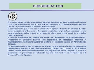 Este documento presenta un trabajo final sobre el uso de las TIC en el aula como recurso didáctico realizado por un estudiante en el Instituto Superior de Formación Docente y Técnica No 68. El instituto ofrece carreras de profesorado y técnicaturas, y cuenta con una pequeña sala de computación. El trabajo analiza datos del instituto y entrevista a dos docentes sobre su uso de las TIC. El objetivo es crear un espacio virtual que promueva el diálogo entre la comunidad educativa, especialmente entre docentes y alumnos, aprove