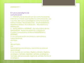 Este documento presenta información sobre cuatro unidades relacionadas con la comunicación digital y las herramientas de aprendizaje en línea. La Unidad 1 describe el nuevo paradigma de comunicación impulsado por Internet y características como la interactividad y la hipertextualidad. La Unidad 2 explora herramientas sincrónicas como chats y videochats. La Unidad 3 cubre herramientas asincrónicas como correo electrónico, blogs y wikis. Finalmente, la Unidad 4 analiza conceptos como educación a distancia, e-learning y b-