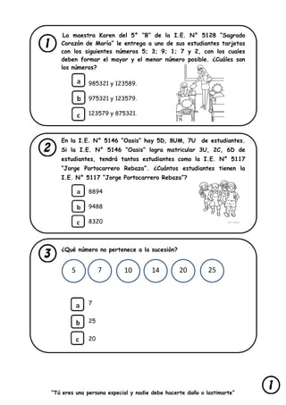 El documento es una prueba de matemáticas para estudiantes de quinto grado, que incluye una variedad de ejercicios y problemas matemáticos. Presenta preguntas sobre números, sucesiones, donaciones, áreas y consumos, y está diseñado para evaluar la comprensión de conceptos básicos en matemáticas. Además, enfatiza la importancia de la autoestima y el respeto hacia uno mismo.