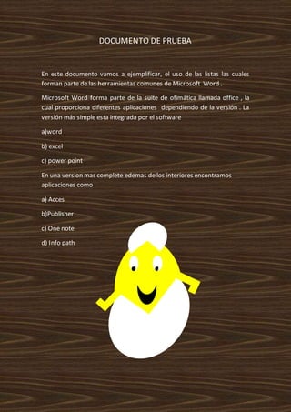 Este documento proporciona ejemplos del uso de listas en Microsoft Word y describe las herramientas básicas y más completas que incluye Microsoft Office. En la versión más simple se incluyen Word, Excel y PowerPoint, mientras que en la versión más completa también se agregan Access, Publisher, One Note e InfoPath. El documento fue elaborado por Kenya Abigail Martínez Cirila como parte de su asignatura de Procesamiento de Información por Medios Digitales en el Colegio de Educación Profesional Técnica del Estado de México, Plantel T
