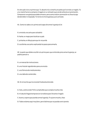 Un tío vive en otro país. El abuelo va a visitarlo y le pide al narrador que le envíe un regalo. Compraron una granja de armar en promoción. Como ya tiene la misma granja armada, el narrador escribirá una carta explicando los pasos para armarla, similar a un manual de instrucciones, para que el primo pueda armarla.