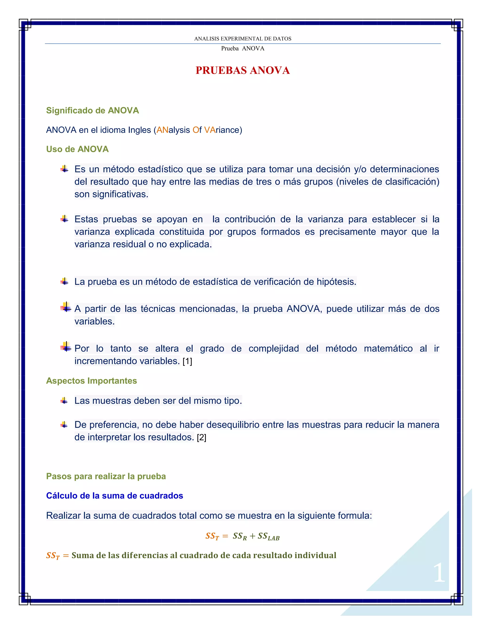 Este documento explica la prueba de ANOVA, un método estadístico utilizado para determinar si hay diferencias significativas entre las medias de tres o más grupos. Describe los pasos para realizar la prueba ANOVA, incluyendo el cálculo de sumas de cuadrados, grados de libertad, cuadrados medios, el estadístico F y el coeficiente de determinación. Finalmente, concluye que la prueba ANOVA puede usarse para comparar los resultados obtenidos por diferentes analistas.