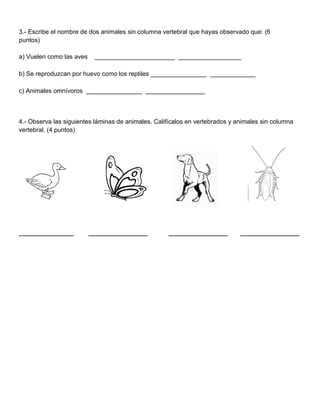 Este documento presenta una guía de evaluación para una visita pedagógica de estudiantes de 3er grado básico a un parque. La guía incluye 4 ítems que evalúan la capacidad de los estudiantes para clasificar animales vertebrados e invertebrados, identificar animales que les llamaron la atención, reconocer características de ciertos animales invertebrados, y calificar animales específicos como vertebrados o invertebrados. La guía provee una pauta de corrección con las respuestas esperadas para