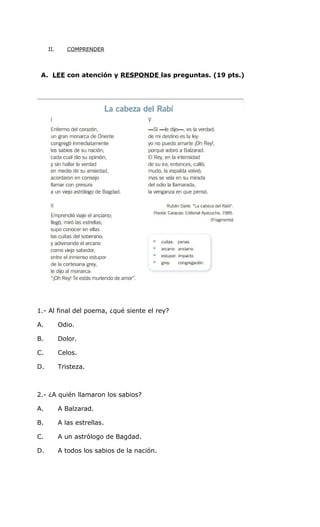 Este documento presenta una prueba de lenguaje para estudiantes de quinto grado. La prueba evalúa la comprensión de textos líricos, el reconocimiento de figuras literarias y la identificación de verbos regulares y formas no personales. Incluye instrucciones, preguntas sobre dos poemas y actividades de análisis poético.