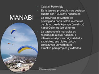 El documento presenta información sobre 8 provincias del Ecuador: Manabí, Esmeraldas, Imbabura, Cotopaxi, Los Ríos, Zamora Chinchipe. Cada provincia incluye su capital, ubicación geográfica, actividades económicas, sitios turísticos y datos demográficos. El documento proporciona datos concisos sobre las características principales de las 8 provincias ecuatorianas.