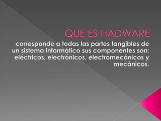 El documento habla sobre los componentes de un sistema informático, incluyendo el software, hardware, entrada, salida y almacenamiento. También define Bluetooth, USB y multimedia, y menciona que sin la contraseña de una red, las personas no podrán conectarse fácilmente a Internet.