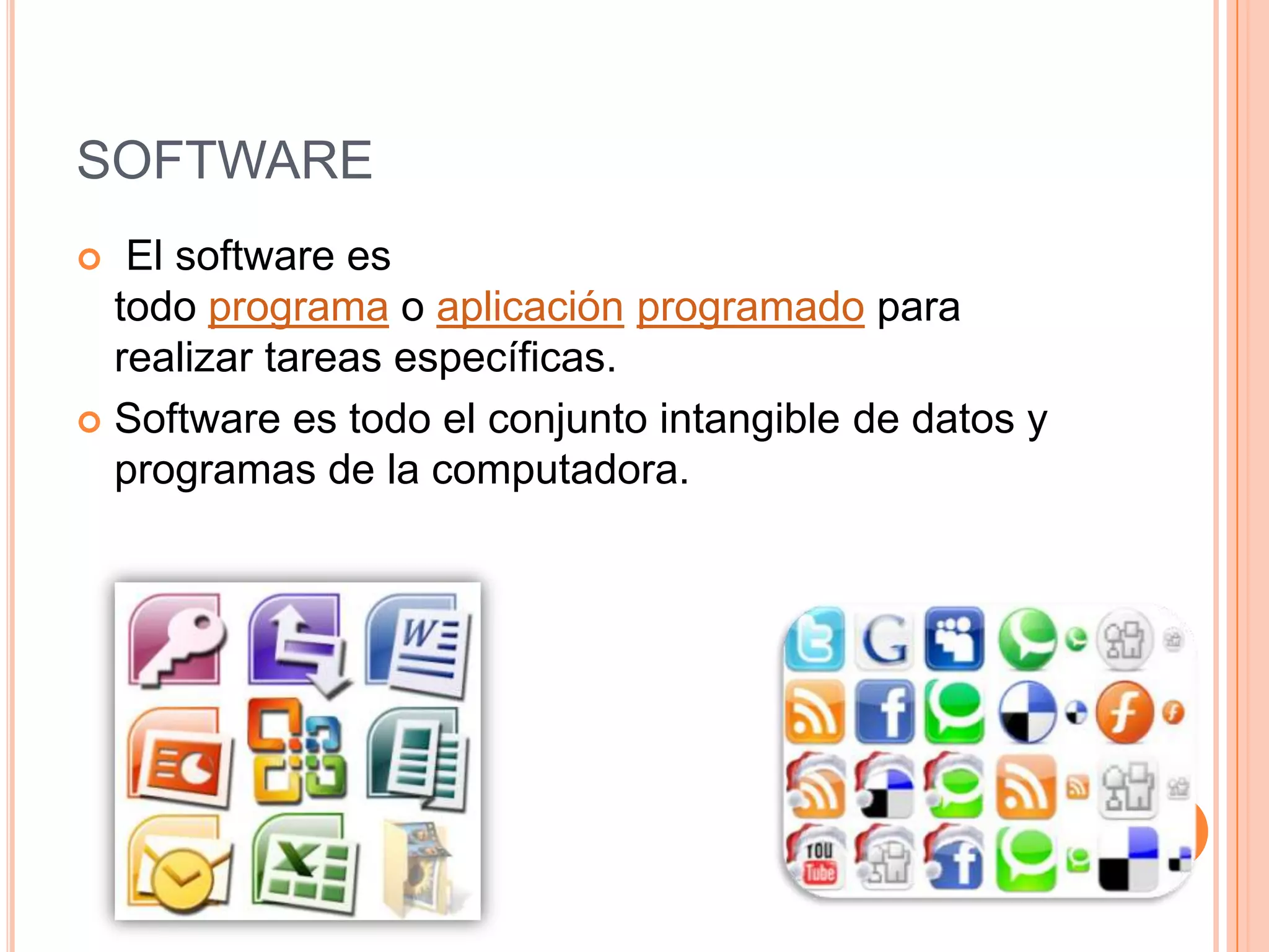 Este documento proporciona definiciones y descripciones de varios conceptos clave relacionados con hardware y software de computadoras. Explica que el software son programas y aplicaciones, y el hardware son los componentes físicos como el mouse, teclado, monitor e impresora. También describe dispositivos de entrada, salida y almacenamiento, así como Bluetooth, USB, multimedia y la importancia de mantener una contraseña en una red Wi-Fi.