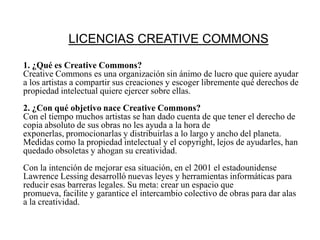 Este documento describe las licencias Creative Commons. Explica que Creative Commons es una organización sin fines de lucro que ayuda a los artistas a compartir y controlar sus creaciones. Ofrece tres tipos principales de licencias: Atribución, que permite el uso siempre que se acredite la autoría; No Comercial, que permite usos no comerciales; y Sin Derivados, que permite usos literales pero no modificaciones.