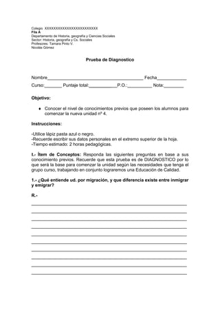 Este documento presenta una prueba de diagnóstico para estudiantes sobre temas de historia y geografía. Contiene preguntas conceptuales sobre migración, zonas rurales vs urbanas, y sectores económicos. También incluye una sección de desarrollo donde se pide un ensayo explicando los sectores económicos primario, secundario y terciario. La prueba es evaluada según una rúbrica que mide la ortografía, respuestas a preguntas y calidad del ensayo.
