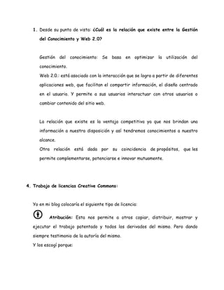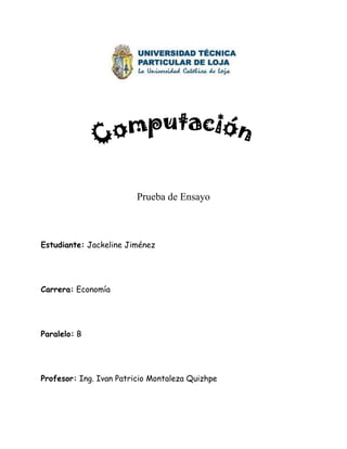 El documento presenta una prueba de ensayo para la estudiante Jackeline Jiménez de la carrera de Economía en el paralelo B. La estudiante responde preguntas sobre la relación entre la gestión del conocimiento y Web 2.0, destacando que permiten compartir información y conocimiento, y sobre su preferencia por una licencia Creative Commons que requiere atribución para permitir usos personales y derivados de su obra manteniendo su autoría.