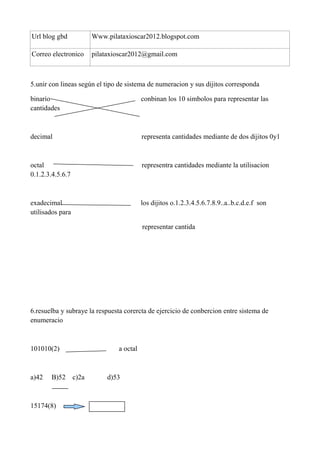 El documento presenta una serie de ejercicios sobre hardware y software de computadoras. En el primer ejercicio se pide identificar el tipo de hardware de entrada, salida o almacenamiento para diferentes dispositivos. En el segundo, clasificar componentes internos y de tarjeta madre. En el tercero, identificar si son verdaderas o falsas definiciones sobre recursos de Internet. En los ejercicios siguientes se pide completar información sobre un blog personal, identificar sistemas de numeración y realizar conversiones entre ellos.