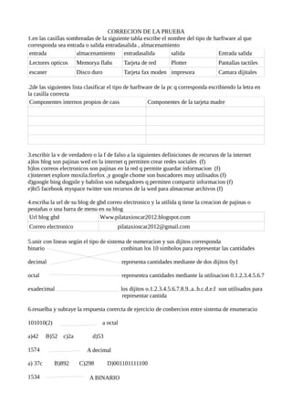 Este documento presenta un ejercicio de corrección de una prueba sobre sistemas de numeración y hardware de computadoras. El ejercicio incluye identificar tipos de hardware como entrada, salida o almacenamiento; clasificar componentes de hardware; determinar la veracidad de definiciones sobre recursos de Internet; y convertir números entre sistemas binarios, octales, decimales y hexadecimales.