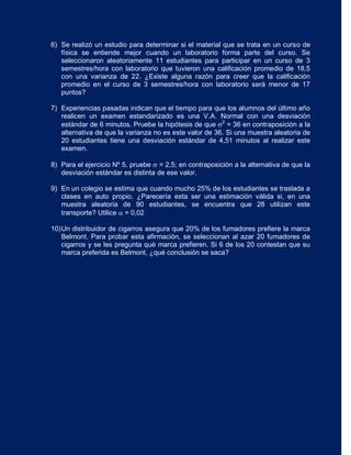 Este documento presenta 10 ejercicios de prueba de hipótesis estadística. Cada ejercicio proporciona datos de una muestra y plantea una hipótesis nula sobre los parámetros de la población para ser probada, generalmente sobre la media o varianza poblacional. Los ejercicios piden calcular valores estadísticos como t de Student o chi cuadrado y determinar si se rechaza o no la hipótesis nula basado en un nivel de significancia dado.