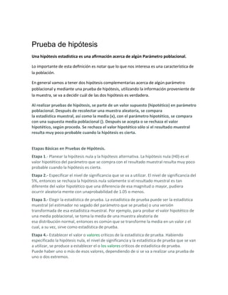El documento presenta información sobre pruebas de hipótesis estadísticas. Explica las etapas básicas de una prueba de hipótesis, incluyendo definir las hipótesis nula y alternativa, elegir el nivel de significancia, seleccionar la estadística de prueba, determinar los valores críticos, y tomar una decisión sobre si rechazar o no la hipótesis nula. También define conceptos clave como errores tipo I y tipo II, y niveles de significancia.