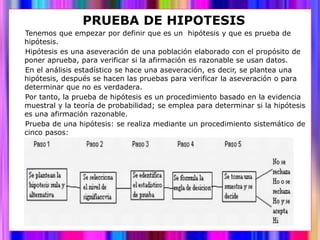 Este documento presenta los pasos para realizar una prueba de hipótesis estadística. Explica que una prueba de hipótesis involucra plantear una hipótesis nula y una hipótesis alternativa, seleccionar un nivel de significancia, calcular un estadístico de prueba, formular una regla de decisión, y tomar una decisión sobre si rechazar o no la hipótesis nula. Luego, provee un ejemplo completo donde se pone a prueba la hipótesis de que el promedio diario