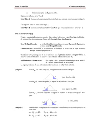 Este documento describe el proceso de prueba de hipótesis estadística. Explica que una hipótesis es un reclamo sobre una población que se pone a prueba usando datos de una muestra. Detalla los pasos para realizar una prueba de hipótesis, incluyendo establecer la hipótesis nula y alterna, calcular una estadística de prueba, determinar la región crítica, y tomar una decisión sobre si rechazar o no la hipótesis nula. También discute conceptos como el n