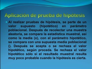Este documento describe los pasos del procedimiento de prueba de hipótesis. Explica que se parte de una hipótesis nula y una hipótesis alternativa. Luego se especifica el nivel de significancia, se establecen los valores críticos y se toma la decisión de aceptar o rechazar la hipótesis nula basado en comparar el valor observado con los valores críticos. También discute conceptos como errores tipo I y tipo II y conclusiones fuertes y débiles.