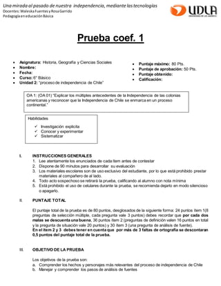 Este documento presenta una prueba de Historia, Geografía y Ciencias Sociales para estudiantes de 6° básico sobre el proceso de independencia de Chile. La prueba contiene 3 ítems que evalúan los objetivos de comprender los hechos y personajes más relevantes de la independencia de Chile y analizar fuentes. El primer ítem consiste en 8 preguntas de selección múltiple, el segundo pide definir conceptos clave y responder una situación, y el tercero analizar una fuente escrita sobre la abolición de la esclavitud