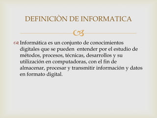 Este documento define conceptos clave de informática como hardware, software, dispositivos de entrada, salida y almacenamiento. También explica Bluetooth, multimedia e Internet y la importancia de mantener una red WiFi con contraseña para proteger la privacidad y el rendimiento de la red.