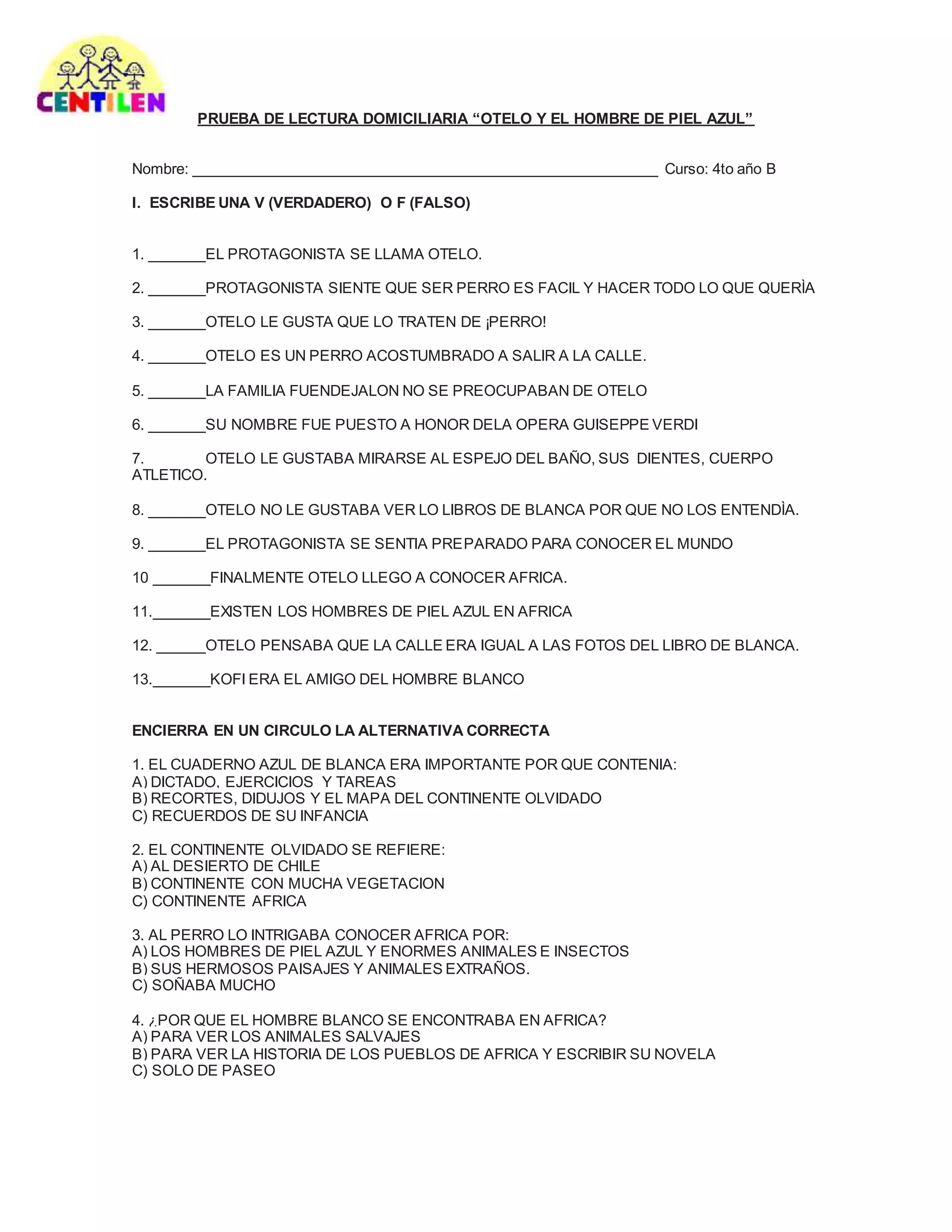 3) El estudiante debe responder las preguntas y explicar brevemente cómo Otelo logra regresar a su casa aunque en realidad nunca salió de África, así como expresar si le gustó el libro y por qué.