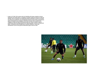 El documento compara la sensación de jugar en el Celtic Park para un equipo visitante con la sensación de ir al dentista, ya que en ambos casos hay un momento de incertidumbre e inicial vulnerabilidad. Aunque se confía en el profesional, el paciente se siente incómodo. Jugar contra el Celtic de Glasgow en su estadio es una experiencia litúrgica que remite a la mejor historia y ambiente del fútbol británico, aunque últimamente al Barcelona no le ha gustado enfrentarse a este equipo.