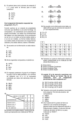 Este documento contiene un examen de química para grado décimo que incluye 20 preguntas sobre diferentes temas como óxidos, ácidos, sales, enlaces iónicos y covalentes. Las preguntas requieren identificar ejemplos correctos de diferentes compuestos químicos y sus propiedades basados en información provista en tablas y textos.