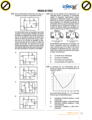 El documento presenta una prueba de física para el grado 11 que contiene varios problemas y preguntas. El primer problema trata sobre circuitos eléctricos en serie y paralelo y cómo afecta la falla de un bombillo. El segundo problema involucra un experimento con péndulos dentro de un camión en movimiento y analiza las fuerzas resultantes. El tercer problema presenta un gráfico de posición vs. tiempo de un motociclista y pregunta sobre su velocidad y aceleración.