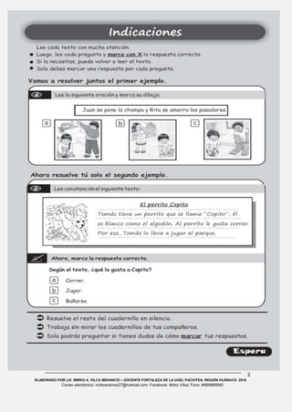 El documento presenta una evaluación de comprensión lectora para estudiantes de segundo grado. Fue elaborado por el Lic. Mirko A. Vilca Benancio y contiene instrucciones para los estudiantes de cómo leer diferentes textos y responder preguntas sobre ellos.