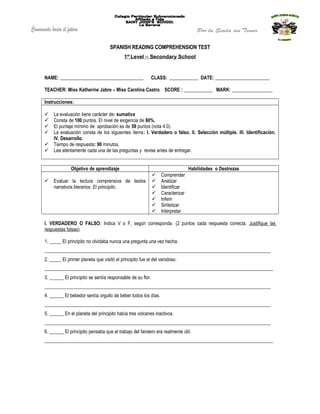 Este documento presenta un examen de comprensión lectora sobre el libro "El Principito" en español. Consta de 100 puntos y se compone de cuatro secciones: verdadero o falso, selección múltiple, identificación y desarrollo. El objetivo es evaluar la comprensión de textos narrativos literarios mediante preguntas sobre detalles de la historia, personajes, temas y habilidades como analizar, caracterizar e interpretar.