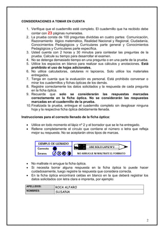 El documento presenta consideraciones sobre la evaluación de conocimientos para la Educación Básica Secundaria en Ecuador, incluyendo instrucciones para el correcto llenado de la ficha óptica. Se indica que la prueba consta de 100 preguntas divididas en cuatro partes y que los postulantes cuentan con 2 horas y 30 minutos para contestarla. Se enfatiza la importancia de seguir las instrucciones y solo marcar las respuestas en la ficha óptica provista.