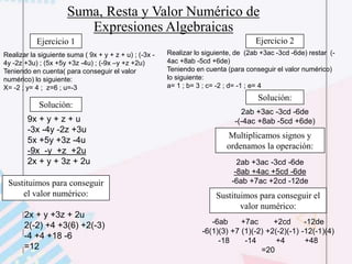 Este documento presenta ejercicios resueltos sobre operaciones algebraicas como suma, resta, multiplicación, división, factorización y radicación de expresiones algebraicas. Los ejercicios incluyen sumas y restas de fracciones algebraicas, aplicación de productos notables, factorización por método de Ruffini y propiedades de radicales como suma, resta, multiplicación y división.