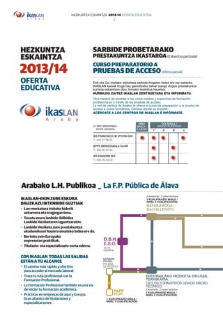 Este documento presenta la oferta educativa de formación profesional para el año 2013-14 de la Asociación de Institutos Públicos de Formación Profesional de Álava. Se describen los 11 centros asociados distribuidos por toda Álava y se ofrecen detalles sobre los ciclos de grado medio y superior disponibles, así como cursos de preparación para pruebas de acceso. También se informa sobre opciones de reconocimiento de experiencia laboral y obtención de certificados de profesionalidad.