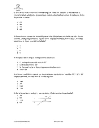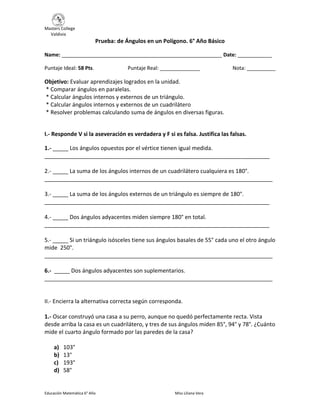 Este documento es una prueba de ángulos en polígonos para estudiantes de 6° año básico. La prueba contiene 10 preguntas de selección múltiple y 4 problemas para calcular valores de ángulos. El objetivo es evaluar el aprendizaje de conceptos como ángulos en paralelas, suma de ángulos internos y externos en triángulos y cuadriláteros, y resolver problemas relacionados.