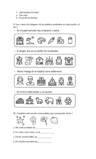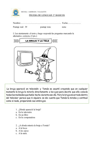 El resumen consta de 3 oraciones: 1. La bruja apareció en la televisión que Tomás estaba mirando y él se asustó pensando que la bruja podría mirarlo a los ojos. 2. La bruja dentro del televisor no se dio cuenta que Tomás la estaba mirando y siguió preparando sus hechizos. 3. La prueba de lenguaje evaluó las habilidades de lectura de estudiantes de 2° básico mediante preguntas sobre un texto e imágenes y completando oraciones y palabras.