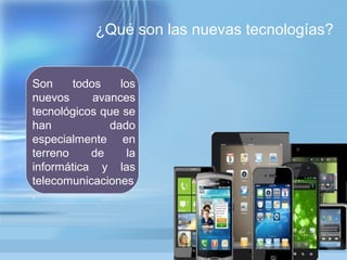 El documento describe las nuevas tecnologías y la sociedad de la información. Se discuten los conceptos de "inmigrantes digitales" versus "nativos digitales" y la brecha digital. También explora cómo las nuevas generaciones usan las tecnologías y por qué, incluyendo factores sociales y culturales. Finalmente, sugiere que las futuras generaciones podrían usar las tecnologías para unificar a la humanidad en lugar de dar prestigio.