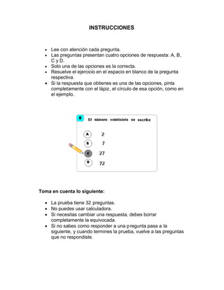 Este documento presenta una prueba de matemáticas para evaluar las destrezas de los estudiantes ecuatorianos. Consta de 32 preguntas sobre diferentes temas matemáticos como operaciones aritméticas, geometría y conjuntos. Se instruye a los estudiantes a leer atentamente cada pregunta y responder marcando la opción correcta.