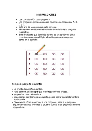 Este documento presenta instrucciones para estudiantes que realizarán una prueba de matemáticas de 32 preguntas. Explica cómo responder cada pregunta marcando la opción correcta y ofrece ejemplos. También indica que no se puede usar calculadora y que deben borrar completamente las respuestas equivocadas. El documento contiene la prueba propiamente dicha con preguntas de diversos temas matemáticos.