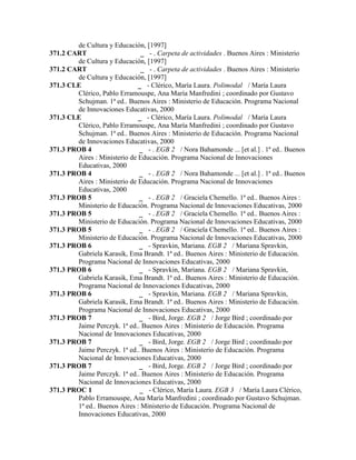 Este documento contiene una lista de referencias bibliográficas de libros y publicaciones relacionadas con la educación. Las referencias incluyen títulos, autores, editoriales y años de publicación. Abarcan temas como educación inicial, matemática, tecnología educativa e innovaciones educativas en Argentina.