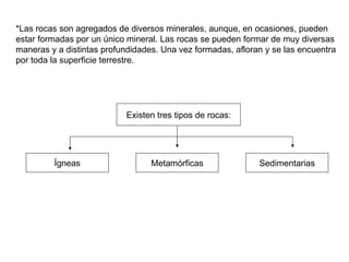 Las rocas se forman de diversas maneras y están compuestas de minerales, existiendo tres tipos principales: ígneas formadas por la solidificación del magma, metamórficas alteradas por cambios de presión y temperatura, y sedimentarias depositadas desde fluidos. Las rocas ígneas se clasifican en plutónicas como el gabro y granito, y volcánicas como el basalto y andesita, dependiendo de su contenido en sílice.