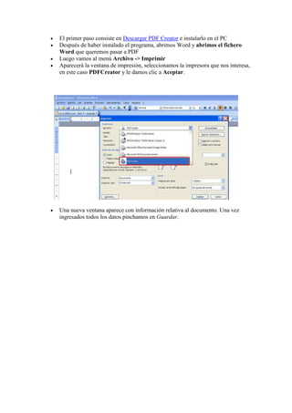 Este documento explica cómo convertir un archivo de Word a PDF utilizando el programa gratuito PDFCreator. Primero se debe descargar e instalar PDFCreator, luego al abrir el archivo de Word y seleccionar "Imprimir", se elige PDFCreator como impresora y se guarda el archivo como PDF en la ubicación deseada. De esta forma, PDFCreator permite convertir fácilmente cualquier tipo de archivo a formato PDF.