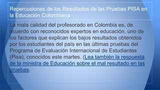 El documento discute los bajos resultados de Colombia en las pruebas PISA y cómo los expertos atribuyen esto en parte a la mala calidad del profesorado en el país. Un estudio reciente financiado por la Fundación Compartir mostró un panorama desolador de la situación de los docentes y lanzó propuestas para mejorar su calidad. Los datos de PISA 2012 mostraron que Colombia ocupó el puesto 62 de 65 naciones evaluadas, diez lugares menos que en 2009, siendo el país que más retrocedió.