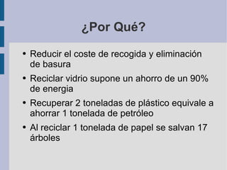 El reciclaje es el proceso de reutilizar partes o elementos desechados de un artículo después de un proceso de tratamiento para que puedan usarse nuevamente, a pesar de haber llegado al final de su vida útil original. Reciclar ayuda a reducir los costos de eliminación de basura y a ahorrar recursos como energía, petróleo y árboles. Los residuos domésticos se separan en contenedores de diferentes colores según su tipo: amarillo para envases, azul para papel y cartón, y verde para vidrio