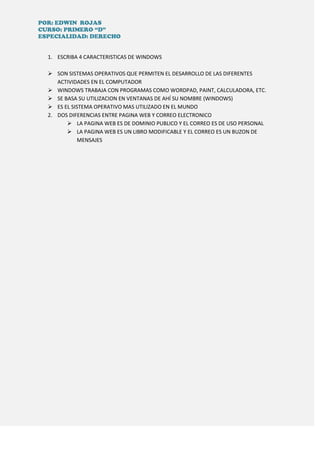 Este documento describe cuatro características clave de Windows que permiten el desarrollo de actividades en una computadora, incluyendo programas como WordPad, Paint y la Calculadora. También explica que Windows se basa en el uso de ventanas, de ahí su nombre. Además, compara una página web, que es de dominio público y modificable, con el correo electrónico, que es de uso personal y funciona como un buzón de mensajes.