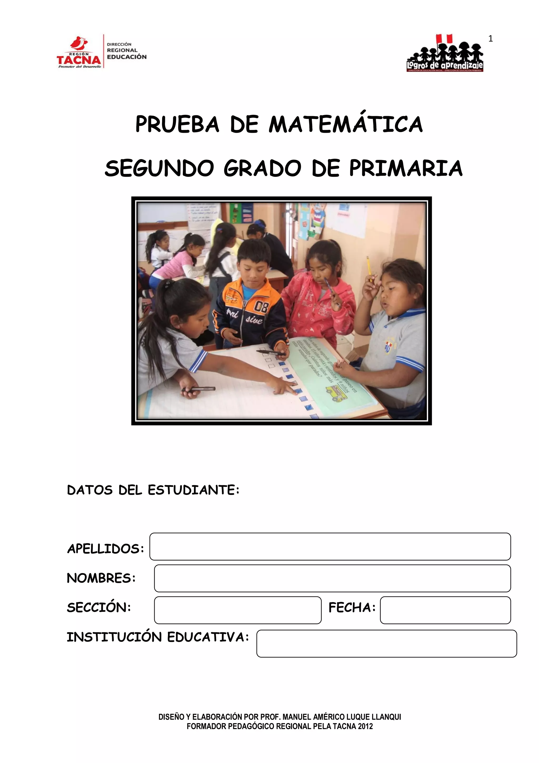 Este documento presenta una prueba de matemática para estudiantes de segundo grado de primaria. Consiste en 20 preguntas de operaciones matemáticas básicas, comparaciones numéricas y resolución de problemas, con tres opciones de respuesta para cada pregunta. Se instruye a los estudiantes a leer cada pregunta con atención y seleccionar una respuesta.