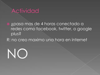 El documento contiene una serie de preguntas sobre el uso y dependencia de las redes sociales a las que la persona responde negativamente. La persona indica que no pasa más de una hora al día en internet, que no se siente ansiosa sin conexión, que prefiere conocer amigos en la vida real y que no se considera adicta a las redes sociales.