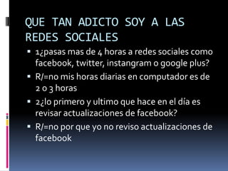 Este documento presenta las respuestas de Santiago Soto Benjumea a 9 preguntas sobre su adicción a las redes sociales. Santiago indica que no pasa más de 2-3 horas al día en redes sociales como Facebook y que no se desespera ni se siente desprotegido cuando no tiene acceso a estas plataformas. Tampoco prefiere actualizar sus redes sociales en lugar de prestar atención durante reuniones con amigos o familia.
