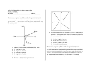 El documento presenta una prueba de física con 8 preguntas. La primera pregunta trata sobre la suma de dos vectores A y B. La segunda pregunta trata sobre la resta de los vectores A y B. La tercera pregunta determina las características del vector resultante R de restar los vectores A y B. Las preguntas 4 y 5 usan una tabla de coordenadas cartesianas para calcular desplazamientos de un avión entre ciudades. Las preguntas 6 y 7 determinan posiciones relativas usando coordenadas. La última pregunta calcula la