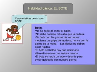 Este documento proporciona información sobre diversas habilidades básicas del baloncesto como el bote, el pase, el tiro a canasta y el rebote. Explica los tipos de botes, pases y tiros, así como la posición correcta y técnica para cada habilidad. También resume brevemente las reglas básicas del baloncesto y los sistemas defensivos.