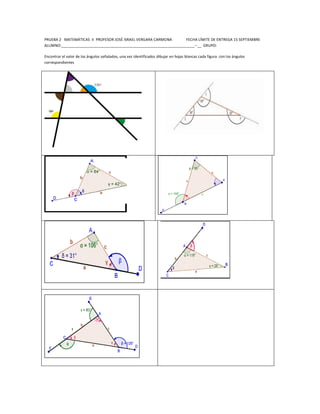 La prueba 2 de Matemáticas II incluye encontrar el valor de ángulos señalados en figuras geométricas y dibujar cada figura con los ángulos correspondientes. Los estudiantes deben completar la prueba y entregarla antes del 15 de septiembre.