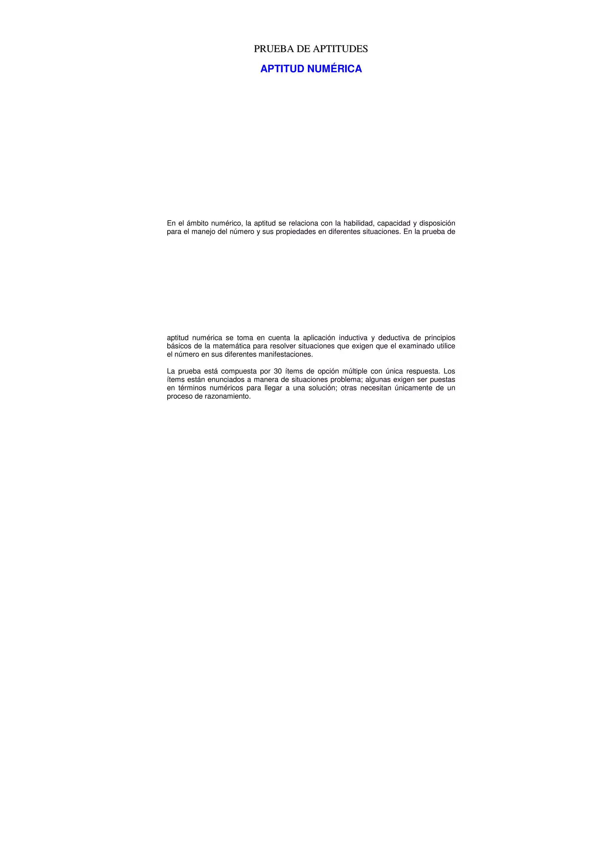La prueba de aptitud numérica evalúa la habilidad para resolver problemas matemáticos mediante 30 preguntas de opción múltiple. Incluye ejemplos de problemas que requieren razonamiento numérico y lógico para determinar relaciones cuantitativas entre variables.